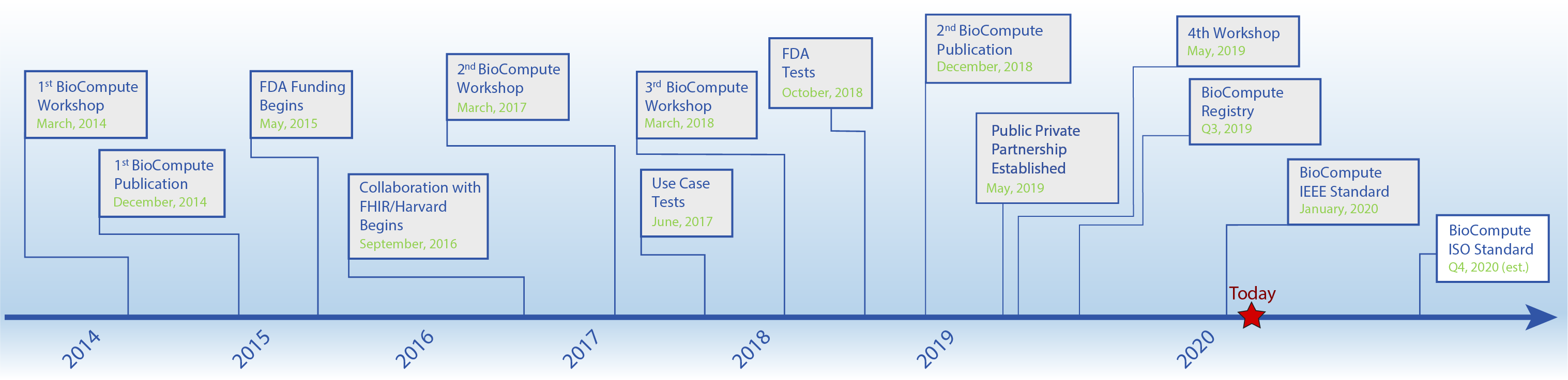 The BioCompute project has generated two publications, three workshops, FDA funding, contributions from over 300 participants, and FDA submissions. The project has worked with individuals from NIH, Harvard, several biotech and pharma companies, EMBL-EBI, Galaxy Project, and many more, and can be integrated with any existing standard for HTS data. The project is expected to be both an IEEE and ISO recognized standard within 8-10 months.